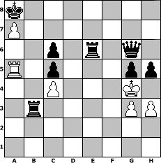 Partie-Notation im PGN-Format [Event "Einfach nur Schach 4"] [Site "www.mySchach.de"] [Date "2024.01.26"] [Round "1"] [White "Achimkogge"] [Black "peter58"] [ECO "C58"] [WhitemyELO "1320"] [BlackmyELO "1534"] [Result "0-1"] [TimeControl "10/864000"] [WhiteDays "68"] [BlackDays "69"] [MySchachNr "131458"] 1. e4 e5 2. Nf3 Nc6 3. Bc4 Nf6 4. Ng5 d5 5. exd5 Na5 6. Bb5+ Bd7 7. Bxd7+ Qxd7 8. a4 Qxd5 9. O-O Be7 10. Nc3 Qd7 11. d3 O-O 12. Be3 h6 13. Nf3 Nc6 14. h3 b6 15. Nb5 a6 16. Nc3 Rfe8 17. Nh4 Bc5 18. Bxc5 bxc5 19. a5 Nd4 20. f3 Rab8 21. b3 Nf5 22. Nxf5 Qxf5 23. Ra4 Rb4 24. Ra3 Qd7 25. Kh2 Nd5 26. Qd2 Nxc3 27. Qxc3 Qd6 28. Kh1 Rh4 29. Qe1 Qf6 30. Qe3 Qd6 31. c4 Qd4 32. Qe2 Re6 33. Rc1 c6 34. Ra2 Qf4 35. Rf1 Rg6 36. Qf2 Qd4 37. Qxd4 Rxd4 38. Rd2 Rgd6 39. Rfd1 f5 40. Kh2 g5 41. g3 Kf7 42. Kg2 e4 43. fxe4 fxe4 44. Rf1+ Ke6 45. Rf8 Ke7 46. Ra8 e3 47. Ra7+ Ke6 48. Re2 Rxd3 49. Kf3 Rxb3 50. Rxa6 Kd7 51. Ra7+ Kc8 52. a6 Kb8 53. Rh7 Re6 54. Ra2 e2+ 55. Kg4 e1=Q 56. a7+ Ka8 57. Rh8+ Re8 58. Rh7 Qe4+ 59. Kh5 Qxh7 60. Ra6 Re6 61. Ra5 Qg6+ 62. Kg4 h5# 0-1 Stellungs-Notation im FEN-Format k7/P7/2p1r1q1/R1p3pp/2P3K1/1r4PP/8/8 - - - 0 63 Geschlagene Figuren Weiss: Geschlagene Figuren Schwarz: Klicken Sie auf eine geschlagene Figur um den gewünschten Zug darzustellen!