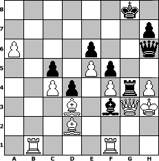 Partie-Notation im PGN-Format [Event "RDK nun 1111 Tage alt"] [Site "www.mySchach.de"] [Date "2007.11.23"] [Round "1"] [White "Pater"] [Black "Papale"] [ECO "C02"] [WhitemyELO "1821"] [BlackmyELO "1768"] [Result "1-0"] [TimeControl "10/1728000"] [WhiteDays "20"] [BlackDays "18"] [MySchachNr "40009"] 1. e4 e6 2. d4 d5 3. e5 c5 4. Qg4 cxd4 5. Nf3 Nc6 6. Bd3 Qa5+ 7. Nbd2 Nh6 8. Qf4 Be7 9. Nxd4 O-O 10. O-O f6 11. N2b3 Qd8 12. Qg3 Nf7 13. Nxc6 bxc6 14. f4 f5 15. Be3 a5 16. Qf2 Nh6 17. Bb6 Qe8 18. Bxa5 Ng4 19. Qe2 c5 20. c4 Bb7 21. h3 Nh6 22. Bd2 Rb8 23. Rac1 d4 24. Na5 Ba8 25. Rb1 Qg6 26. a3 Nf7 27. b4 Qh6 28. b5 Kh8 29. Nc6 Rbe8 30. Nxe7 Rxe7 31. a4 Rg8 32. g3 g5 33. Kh2 g4 34. h4 Bf3 35. Qe1 Kg7 36. b6 Nh8 37. a5 Ng6 38. a6 Kh8 39. b7 Reg7 40. b8=Q Nxh4 41. gxh4 g3+ 42. Kh3 Rg4 43. Qxg8+ Kxg8 44. Qxg3 1-0 Stellungs-Notation im FEN-Format 6k1/7p/P3p2q/2p1Pp2/2Pp1PrP/3B1bQK/3B4/1R3R2 - - - 0 44 Geschlagene Figuren Weiss: Geschlagene Figuren Schwarz: Klicken Sie auf eine geschlagene Figur um den gewünschten Zug darzustellen!