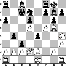 Partie-Notation im PGN-Format [Event "Weinprobe 2018"] [Site "www.mySchach.de"] [Date "2018.10.01"] [Round "1"] [White "Geisterreiter"] [Black "alibengali"] [ECO "A16"] [WhitemyELO "1336"] [BlackmyELO "1669"] [Result "0-1"] [TimeControl "10/1728000"] [WhiteDays "04"] [BlackDays "19"] [MySchachNr "113173"] 1. c4 Nf6 2. Nc3 g6 3. f3 Bg7 4. d4 O-O 5. e4 d6 6. Bd3 e5 7. d5 c6 8. Bg5 Nbd7 9. f4 cxd5 10. f5 dxc4 11. Be2 Qc7 12. h3 a6 13. Nf3 b5 14. Qd2 b4 15. Nd5 Nxd5 16. exd5 e4 17. Nh4 c3 0-1 Stellungs-Notation im FEN-Format r1b2rk1/2qn1pbp/p2p2p1/3P1PB1/1p2p2N/2p4P/PPPQB1P1/R3K2R - KQ - 0 18 Geschlagene Figuren Weiss: ![]() ![]() ![]() ![]() ![]() ![]() ![]() ![]() ![]() ![]() ![]() ![]() ![]() ![]() ![]() Geschlagene Figuren Schwarz: ![]() ![]() ![]() ![]() ![]() ![]() ![]() ![]() ![]() ![]() ![]() ![]() ![]() ![]() ![]() Klicken Sie auf eine geschlagene Figur um den gewünschten Zug darzustellen!