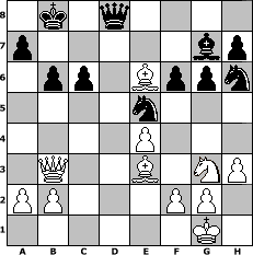 Partie-Notation im PGN-Format [Event "Winterturnier"] [Site "www.mySchach.de"] [Date "2009.11.12"] [Round "1"] [White "reymund"] [Black "sprinterde"] [ECO "A41"] [WhitemyELO "1624"] [BlackmyELO "1558"] [Result "1/2-1/2"] [TimeControl "10/3456000"] [WhiteDays "156"] [BlackDays "079"] [MySchachNr "60569"] 1. d4 d6 2. e4 e6 3. Nf3 Nf6 4. Nc3 c6 5. Bd3 Nbd7 6. O-O Qa5 7. Bd2 Qh5 8. Ne2 e5 9. Ng3 Qg6 10. h3 Ng8 11. Bc3 f6 12. Nh4 Qf7 13. Nhf5 g6 14. Ne3 exd4 15. Bxd4 Ne5 16. Be2 Qe7 17. c4 Be6 18. Rc1 Bg7 19. c5 Nd7 20. Nc4 Bxc4 21. Bxc4 dxc5 22. Be3 O-O-O 23. Qb3 Nh6 24. Rfd1 Ne5 25. Be6+ Kb8 26. Rxd8+ Rxd8 27. Bxc5 Qc7 28. Rd1 b6 29. Rxd8+ Qxd8 30. Be3 1/2-1/2 Stellungs-Notation im FEN-Format 1k1q4/p5bp/1pp1Bppn/4n3/4P3/1Q2B1NP/PP3PP1/6K1 - - - 1 30 Geschlagene Figuren Weiss: Geschlagene Figuren Schwarz: Klicken Sie auf eine geschlagene Figur um den gewünschten Zug darzustellen!