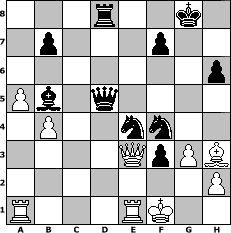Partie-Notation im PGN-Format [Event "In Memoriam lotchi II"] [Site "www.mySchach.de"] [Date "2023.02.14"] [Round "1"] [White "Rotstift10"] [Black "Leon"] [ECO "D02"] [WhitemyELO "1676"] [BlackmyELO "1596"] [Result "0-1"] [TimeControl "10/864000"] [WhiteDays "39"] [BlackDays "39"] [MySchachNr "129398"] 1. d4 d5 2. Nf3 Nf6 3. g3 Nc6 4. Bg2 e6 5. Bf4 Bd6 6. Bxd6 cxd6 7. O-O O-O 8. Nc3 e5 9. e3 Be6 10. Ng5 Bg4 11. f3 Bd7 12. Nb5 h6 13. Nh3 Qb6 14. dxe5 dxe5 15. Nc3 d4 16. Na4 Qa5 17. c3 Ne7 18. exd4 Bxa4 19. b3 Bd7 20. b4 Qb6 21. Kh1 exd4 22. cxd4 Nf5 23. Qd2 Rad8 24. a4 Rfe8 25. Nf4 Nxd4 26. a5 Qd6 27. Rfd1 Bc6 28. Qf2 g5 29. Nd3 g4 30. Ne1 Rxe1+ 31. Rxe1 gxf3 32. Bh3 Qd5 33. Kg1 Ne2+ 34. Kf1 Ne4 35. Qxa7 Bb5 36. Qe3 Nf4+ 0-1 Stellungs-Notation im FEN-Format 3r2k1/1p3p2/7p/Pb1q4/1P2nn2/4QpPB/7P/R3RK2 - - - 3 37 Geschlagene Figuren Weiss: Geschlagene Figuren Schwarz: Klicken Sie auf eine geschlagene Figur um den gewünschten Zug darzustellen!