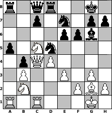 Partie-Notation im PGN-Format [Event "Winter 2011/12"] [Site "www.mySchach.de"] [Date "2011.12.22"] [Round "2"] [White "retep1"] [Black "deepsabel"] [ECO "D02"] [WhitemyELO "1805"] [BlackmyELO "1984"] [Result "1/2-1/2"] [TimeControl "10/2592000"] [WhiteDays "90"] [BlackDays "63"] [MySchachNr "78434"] 1. d4 d5 2. Nf3 Nf6 3. c4 e6 4. g3 dxc4 5. Bg2 a6 6. O-O Nc6 7. Bg5 Be7 8. e3 Nd5 9. Bxe7 Ncxe7 10. Ne5 b5 11. b3 cxb3 12. axb3 Bb7 13. Qe2 O-O 14. Rc1 Qc8 15. Qc2 Rd8 16. Nd2 f6 17. Nd3 a5 18. Ne4 Bc6 19. Bh1 Be8 20. Nec5 Bf7 21. Bg2 b4 22. Nb2 Bg6 23. Qc4 1/2-1/2 Stellungs-Notation im FEN-Format r1qr2k1/2p1n1pp/4ppb1/p1Nn4/1pQP4/1P2P1P1/1N3PBP/R1R3K1 - - - 3 23 Geschlagene Figuren Weiss: Geschlagene Figuren Schwarz: Klicken Sie auf eine geschlagene Figur um den gewünschten Zug darzustellen!