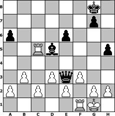 Partie-Notation im PGN-Format [Event "Nach dem Weltuntergang 2012"] [Site "www.mySchach.de"] [Date "2012.12.27"] [Round "1"] [White "sprinterde"] [Black "Stecher1966"] [ECO "B40"] [WhitemyELO "1675"] [BlackmyELO "1501"] [Result "0-1"] [TimeControl "10/864000"] [WhiteDays "10"] [BlackDays "07"] [MySchachNr "85701"] 1. e4 c5 2. Nf3 e6 3. Nc3 Nc6 4. Bb5 a6 5. Bxc6 bxc6 6. d3 d5 7. Bf4 Bd6 8. e5 Be7 9. O-O f6 10. exf6 Nxf6 11. Ne5 Bb7 12. Bg5 O-O 13. Qe1 Nd7 14. Nxd7 Qxd7 15. Bxe7 Qxe7 16. Na4 Rf5 17. Qa5 d4 18. Qb6 Raf8 19. Rae1 h6 20. f3 h5 21. Re4 c4 22. Rxd4 Rb5 23. Qa7 Ra8 24. Qxa8+ Bxa8 25. Rxc4 c5 26. b3 Bd5 27. Rc3 Qg5 28. Nxc5 Rxc5 29. Rxc5 Qe3+ 0-1 Stellungs-Notation im FEN-Format 6k1/6p1/p3p3/2Rb3p/8/1P1PqP2/P1P1P1PP/5RK1 - - - 1 30 Geschlagene Figuren Weiss: Geschlagene Figuren Schwarz: Klicken Sie auf eine geschlagene Figur um den gewünschten Zug darzustellen!