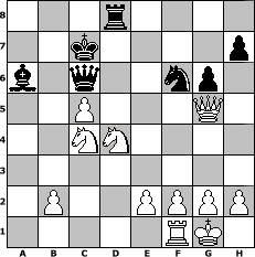 Partie-Notation im PGN-Format [Event "Jagdvariante - die Zweite"] [Site "www.mySchach.de"] [Date "2006.06.07"] [Round "2"] [White "HPB2005"] [Black "Naunhofer"] [ECO "C70"] [WhitemyELO "1945"] [BlackmyELO "1676"] [Result "1-0"] [TimeControl "10/2592000"] [WhiteDays "67"] [BlackDays "82"] [MySchachNr "25985"] 1. e4 e5 2. Nf3 Nc6 3. Bb5 a6 4. Ba4 b5 5. Bb3 Na5 6. Bxf7+ Kxf7 7. Nxe5+ Ke6 8. a4 Nf6 9. axb5 axb5 10. d4 Bb7 11. O-O d5 12. Qe1 c5 13. exd5+ Qxd5 14. Nf3+ Kd7 15. Rxa5 Rxa5 16. Qxa5 cxd4 17. Bf4 Bd6 18. Bxd6 Qxd6 19. Qxb5+ Kc7 20. Nbd2 Ra8 21. Qg5 g6 22. c4 Rd8 23. c5 Qc6 24. Nc4 Ba6 25. Nxd4 1-0 Stellungs-Notation im FEN-Format 3r4/2k4p/b1q2np1/2P3Q1/2NN4/8/1P2PPPP/5RK1 - - - 0 25 Geschlagene Figuren Weiss: ![]() ![]() ![]() ![]() ![]() ![]() ![]() ![]() ![]() ![]() ![]() ![]() ![]() ![]() ![]() Geschlagene Figuren Schwarz: ![]() ![]() ![]() ![]() ![]() ![]() ![]() ![]() ![]() ![]() ![]() ![]() ![]() ![]() ![]() Klicken Sie auf eine geschlagene Figur um den gewünschten Zug darzustellen!