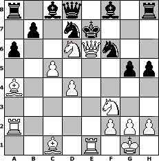 Partie-Notation im PGN-Format [Event "Ferien-Turnier"] [Site "www.mySchach.de"] [Date "2005.07.23"] [Round "1"] [White "ParvusCarlsen"] [Black "MichaelKnopf"] [ECO "C02"] [WhitemyELO "1594"] [BlackmyELO "1495"] [Result "1-0"] [TimeControl "10/2592000"] [WhiteDays "85"] [BlackDays "90"] [MySchachNr "15410"] 1. e4 e6 2. d4 d5 3. e5 c5 4. c3 c4 5. Nf3 h6 6. b3 cxb3 7. Bb5+ Nd7 8. axb3 Qb6 9. Ba4 a6 10. c4 dxc4 11. bxc4 Qb4+ 12. Nbd2 Qc3 13. Ra2 Qb4 14. O-O Qb6 15. c5 Qd8 16. Nc4 Ke7 17. Nd6 f6 18. Qe2 h5 19. Re1 g5 20. exf6+ Ngxf6 21. Qxe6# 1-0 Stellungs-Notation im FEN-Format r1bq1b1r/1p1nk3/p2NQn2/2P3pp/B2P4/5N2/R4PPP/2B1R1K1 - - - 0 21 Geschlagene Figuren Weiss: Geschlagene Figuren Schwarz: Klicken Sie auf eine geschlagene Figur um den gewünschten Zug darzustellen!