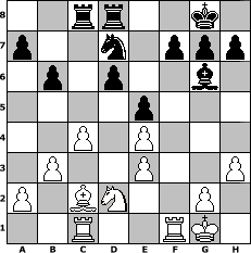 Partie-Notation im PGN-Format [Event "Das 1500er Turnier"] [Site "www.mySchach.de"] [Date "2009.06.19"] [Round "1"] [White "Andreas"] [Black "Stecher1"] [ECO "B54"] [WhitemyELO "1551"] [BlackmyELO "1585"] [Result "1/2-1/2"] [TimeControl "10/1728000"] [WhiteDays "20"] [BlackDays "14"] [MySchachNr "56711"] 1. e4 c5 2. Nf3 d6 3. d4 cxd4 4. Nxd4 e5 5. Nf3 Nf6 6. Nc3 Be7 7. Be2 O-O 8. Bg5 Qb6 9. Bxf6 Bxf6 10. Nd5 Qd8 11. O-O Nd7 12. Nxf6+ Nxf6 13. Bd3 Bg4 14. h3 Bh5 15. c3 Qb6 16. b3 Rfd8 17. Qe2 Rac8 18. c4 Nd7 19. Qe3 Qxe3 20. fxe3 Nc5 21. Bc2 Bg6 22. Nd2 Nd7 23. Rac1 b6 1/2-1/2 Stellungs-Notation im FEN-Format 2rr2k1/p2n1ppp/1p1p2b1/4p3/2P1P3/1P2P2P/P1BN2P1/2R2RK1 - - - 0 24 Geschlagene Figuren Weiss: Geschlagene Figuren Schwarz: Klicken Sie auf eine geschlagene Figur um den gewünschten Zug darzustellen!