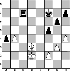 Partie-Notation im PGN-Format [Event "Bremer Schl"] [Site "www.mySchach.de"] [Date "2008.11.01"] [Round "1"] [White "muetoe"] [Black "Dragonwolves"] [ECO "A05"] [WhitemyELO "1940"] [BlackmyELO "2163"] [Result "0-1"] [TimeControl "10/2592000"] [WhiteDays "170"] [BlackDays "166"] [MySchachNr "49378"] 1. Nf3 Nf6 2. c4 c5 3. Nc3 Nc6 4. d4 cxd4 5. Nxd4 e6 6. g3 Qb6 7. Ndb5 Ne5 8. Bg2 a6 9. Na3 Bxa3 10. bxa3 Nxc4 11. Bg5 Ng4 12. O-O Nge5 13. Rb1 Qa7 14. Rb4 d5 15. e4 d4 16. Ne2 f6 17. Bf4 a5 18. Rb3 Nc6 19. Qd3 Qa6 20. Rc1 e5 21. Rxc4 a4 22. Rbb4 Nxb4 23. axb4 O-O 24. Nxd4 exd4 25. Rxd4 Qxd3 26. Rxd3 Be6 27. a3 Rfd8 28. Bf1 Rxd3 29. Bxd3 Rd8 30. Be2 Rc8 31. Bb5 Bb3 32. Kg2 Bc2 33. Bd2 Bxe4+ 34. Kf1 Bd5 35. Ke1 Bb3 36. Bd3 Bc4 37. Bb1 g6 38. Be3 Rd8 39. Bb6 Rd7 40. h4 Kf7 41. Be3 b5 42. Be4 f5 43. Bg2 Rd3 44. Bc1 Bb3 45. Bd2 Bc2 46. Bf1 Rxa3 47. Bxb5 Bd3 48. Bc1 Ra1 49. Bxd3 Rxc1+ 50. Kd2 Rc7 0-1 Stellungs-Notation im FEN-Format 8/2r2k1p/6p1/5p2/pP5P/3B2P1/3K1P2/8 - - - 2 51 Geschlagene Figuren Weiss: Geschlagene Figuren Schwarz: Klicken Sie auf eine geschlagene Figur um den gewünschten Zug darzustellen!
