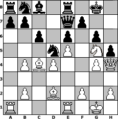 Partie-Notation im PGN-Format [Event "Herbst 2017"] [Site "www.mySchach.de"] [Date "2017.09.12"] [Round "1"] [White "lisama"] [Black "Steffi"] [ECO "A13"] [WhitemyELO "1502"] [BlackmyELO "1558"] [Result "1-0"] [TimeControl "10/2592000"] [WhiteDays "55"] [BlackDays "25"] [MySchachNr "109533"] 1. c4 e6 2. d4 d5 3. Nc3 Nf6 4. Nf3 Bb4 5. Bd2 O-O 6. e3 c6 7. Bd3 dxc4 8. Bxc4 Nd5 9. Qc2 Qa5 10. O-O Nxc3 11. a3 Nd5 12. axb4 Qd8 13. Rfe1 Re8 14. e4 Nf6 15. e5 Nd5 16. Ng5 g6 17. Qe4 Qe7 18. Qh4 h5 19. g4 1-0 Stellungs-Notation im FEN-Format rnb1r1k1/pp2qp2/2p1p1p1/3nP1Np/1PBP2PQ/8/1P1B1P1P/R3R1K1 - - - 0 19 Geschlagene Figuren Weiss: Geschlagene Figuren Schwarz: Klicken Sie auf eine geschlagene Figur um den gewünschten Zug darzustellen!