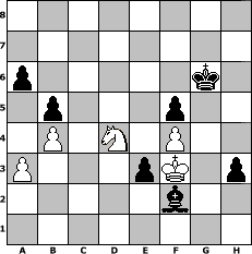 | Partie-Notation im PGN-Format [Event "Albspiele 21"] [Site "www.mySchach.de"] [Date "2012.05.10"] [Round "1"] [White "Knight"] [Black "Haki"] [ECO "D00"] [WhitemyELO "1220"] [BlackmyELO "1325"] [Result "1/2-1/2"] [TimeControl "10/1728000"] [WhiteDays "20"] [BlackDays "20"] [MySchachNr "81650"] 1. d4 d5 2. e4 dxe4 3. Nc3 f5 4. f3 Nf6 5. Be3 c6 6. f4 g6 7. Bc4 e6 8. Qe2 Bb4 9. Qd2 Nd5 10. O-O-O Nxe3 11. Qxe3 O-O 12. Nge2 Nd7 13. Bxe6+ Kh8 14. h4 Nf6 15. Bxc8 Rxc8 16. d5 cxd5 17. Qd4 Bc5 18. Qd2 a6 19. Nxd5 Ng4 20. Rdf1 Nf6 21. Ndc3 Qxd2+ 22. Kxd2 Bb4 23. a3 Rfd8+ 24. Kc1 Bc5 25. Kb1 Nd5 26. Nxd5 Rxd5 27. c4 Rd2 28. Nc3 Bd4 29. g3 Rxc4 30. Rc1 b5 31. h5 Kg7 32. Rhe1 Bf2 33. Re2 Rxe2 34. Nxe2 Rxc1+ 35. Kxc1 gxh5 36. Kd1 e3 37. b4 h4 38. gxh4 Bxh4 39. Kc2 h5 40. Kd3 Bf2 41. Nd4 Kg6 42. Ke2 h4 43. Kf3 h3 44. Ne2 Kh5 45. Nd4 Kg6 46. Ne2 Kh6 47. Nd4 Kg6 1/2-1/2 Stellungs-Notation im FEN-Format 8/8/p5k1/1p3p2/1P1N1P2/P3pK1p/5b2/8 - - - 8 48 Geschlagene Figuren Weiss:                              Geschlagene Figuren Schwarz:                               Klicken Sie auf eine geschlagene Figur um den gewünschten Zug darzustellen!