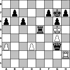 Partie-Notation im PGN-Format [Event "Einfach nur Schach 8"] [Site "www.mySchach.de"] [Date "2025.11.14"] [Round "1"] [White "Achimkogge"] [Black "peter58"] [ECO "C26"] [WhitemyELO "1241"] [BlackmyELO "1531"] [Result "0-1"] [TimeControl "10/864000"] [WhiteDays "49"] [BlackDays "48"] [MySchachNr "133928"] 1. e4 e5 2. Nc3 Nf6 3. a3 Nc6 4. Nf3 Be7 5. Bb5 d6 6. d3 O-O 7. h3 Bd7 8. Bg5 a6 9. Bc4 Nd4 10. Nxd4 exd4 11. Nd5 Nxd5 12. Bxd5 c6 13. Bb3 Bxg5 14. g3 Qa5+ 15. Kf1 Rae8 16. h4 Bd8 17. Kg2 Be6 18. c4 dxc3 19. bxc3 Qxc3 20. Bxe6 Rxe6 21. Ra2 Qd4 22. Qc2 Re5 23. Re1 Rfe8 24. Re3 g6 25. Kh3 Rc5 26. Qd2 d5 27. f3 dxe4 28. fxe4 Kg7 29. Qe2 Rh5 30. g4 Rxh4+ 31. Kg3 Qe5+ 32. Kf3 Qf6+ 33. Kg3 Bc7+ 34. e5 Bxe5+ 35. Rxe5 Rxe5 36. Qf3 Rh3+ 37. Kxh3 Qxf3+ 38. Kh4 Re3 39. Rh2 Qg3+ 40. Kg5 Re5# 0-1 Stellungs-Notation im FEN-Format 8/1p3pkp/p1p3p1/4r1K1/6P1/P2P2q1/7R/8 - - - 6 41 Geschlagene Figuren Weiss: Geschlagene Figuren Schwarz: Klicken Sie auf eine geschlagene Figur um den gewünschten Zug darzustellen!
