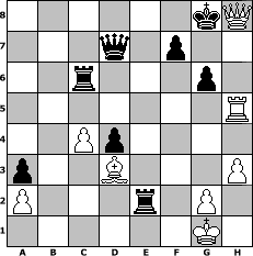 Partie-Notation im PGN-Format [Event "Michail-Tal-Memorial"] [Site "www.mySchach.de"] [Date "2010.03.30"] [Round "1"] [White "Sherlock6834"] [Black "Joschi"] [ECO "A48"] [WhitemyELO "1579"] [BlackmyELO "1561"] [Result "1-0"] [TimeControl "10/3456000"] [WhiteDays "194"] [BlackDays "195"] [MySchachNr "64438"] 1. d4 Nf6 2. Nf3 g6 3. c4 c5 4. d5 b5 5. Nc3 b4 6. Na4 d6 7. Bg5 Bg7 8. e3 Nbd7 9. Bd3 O-O 10. e4 Nb6 11. Nxb6 Qxb6 12. Qd2 Bg4 13. Qf4 Bxf3 14. Qxf3 a5 15. O-O a4 16. h3 h6 17. Be3 Qc7 18. Qe2 Rfe8 19. Qd2 Kh7 20. f4 a3 21. e5 dxe5 22. fxe5 Qxe5 23. bxa3 bxa3 24. Rae1 Qc7 25. Bf4 Qb6 26. Re2 Nh5 27. Be3 Nf6 28. Qe1 e6 29. dxe6 Rxe6 30. Qf2 Rc6 31. Rb1 Qc7 32. Rb5 Rc8 33. Bf4 Qd7 34. Rd2 Qe6 35. Ra5 Nh5 36. Be3 Bd4 37. Bxd4 cxd4 38. Rxh5 Re8 39. Re2 Qd7 40. Qf4 Rxe2 41. Qxh6+ Kg8 42. Qh8# 1-0 Stellungs-Notation im FEN-Format 6kQ/3q1p2/2r3p1/7R/2Pp4/p2B3P/P3r1P1/6K1 - - - 2 42 Geschlagene Figuren Weiss: ![]() ![]() ![]() ![]() ![]() ![]() ![]() ![]() ![]() ![]() ![]() ![]() ![]() ![]() ![]() Geschlagene Figuren Schwarz: ![]() ![]() ![]() ![]() ![]() ![]() ![]() ![]() ![]() ![]() ![]() ![]() ![]() ![]() ![]() Klicken Sie auf eine geschlagene Figur um den gewünschten Zug darzustellen!