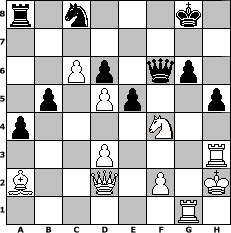 Partie-Notation im PGN-Format [Event "M"] [Site "www.mySchach.de"] [Date "2009.03.12"] [Round "1"] [White "Grubengeist"] [Black "nordlicht"] [ECO "C78"] [WhitemyELO "1931"] [BlackmyELO "1953"] [Result "1-0"] [TimeControl "10/1728000"] [WhiteDays "17"] [BlackDays "18"] [MySchachNr "53593"] 1. e4 e5 2. Nf3 Nc6 3. Bb5 a6 4. Ba4 Nf6 5. O-O b5 6. Bb3 Bb7 7. d3 Be7 8. Nc3 d6 9. a3 O-O 10. Be3 Qd7 11. Nd5 Nxd5 12. exd5 Na7 13. Qe2 c5 14. Ba2 Qg4 15. h3 Qg6 16. Rfe1 a5 17. b4 cxb4 18. axb4 a4 19. c4 Bc8 20. Kh2 Bf5 21. Bb1 Rfb8 22. c5 Re8 23. c6 Bf6 24. g4 Bxg4 25. hxg4 Qxg4 26. Nd2 Qxb4 27. Ne4 Be7 28. Ba2 f5 29. Rab1 Qa5 30. Bd2 Qd8 31. Ng3 Bg5 32. Nxf5 Rf8 33. Ng3 Bxd2 34. Qxd2 Rf4 35. Re4 Rf3 36. Rg4 Qc8 37. Rh4 Qd8 38. Rh3 Rf4 39. Rg1 g6 40. Ne4 Nc8 41. Ng5 h5 42. Ne6 Qf6 43. Nxf4 1-0 Stellungs-Notation im FEN-Format r1n3k1/8/2Pp1qp1/1p1Pp2p/p4N2/3P3R/B2Q1P1K/6R1 - - - 0 43 Geschlagene Figuren Weiss: Geschlagene Figuren Schwarz: Klicken Sie auf eine geschlagene Figur um den gewünschten Zug darzustellen!