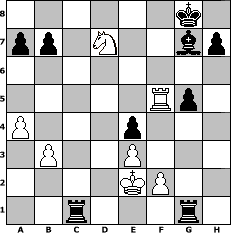 Partie-Notation im PGN-Format [Event "Trainingslager II"] [Site "www.mySchach.de"] [Date "2011.05.24"] [Round "2"] [White "reisender"] [Black "Helmut48"] [ECO "A80"] [WhitemyELO "1322"] [BlackmyELO "1880"] [Result "0-1"] [TimeControl "10/1728000"] [WhiteDays "20"] [BlackDays "20"] [MySchachNr "74157"] 1. d4 f5 2. c3 Nf6 3. g3 e6 4. Bg2 Be7 5. Nf3 O-O 6. Nbd2 d5 7. Ne5 Nbd7 8. Nxd7 Bxd7 9. Nf3 c5 10. Ne5 cxd4 11. Qxd4 Ne4 12. Bxe4 fxe4 13. Bf4 Be8 14. O-O Qa5 15. c4 Rf5 16. b3 Bf6 17. h3 g5 18. g4 Rxf4 19. e3 Rf3 20. cxd5 exd5 21. Rfd1 Rxh3 22. Qxd5+ Qxd5 23. Rxd5 Bc6 24. Rad1 Bxd5 25. Rxd5 Rh4 26. Nd7 Rxg4+ 27. Kf1 Bg7 28. a4 Rc8 29. Rf5 Rc1+ 30. Ke2 Rgg1 0-1 Stellungs-Notation im FEN-Format 6k1/pp1N2bp/8/5Rp1/P3p3/1P2P3/4KP2/2r3r1 - - - 5 31 Geschlagene Figuren Weiss: Geschlagene Figuren Schwarz: Klicken Sie auf eine geschlagene Figur um den gewünschten Zug darzustellen!