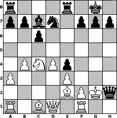 Partie-Notation im PGN-Format [Event "Winter 2011/12"] [Site "www.mySchach.de"] [Date "2011.12.22"] [Round "1"] [White "lasker"] [Black "Koprek"] [ECO "D37"] [WhitemyELO "1286"] [BlackmyELO "1996"] [Result "0-1"] [TimeControl "10/2592000"] [WhiteDays "50"] [BlackDays "38"] [MySchachNr "78373"] 1. d4 d5 2. c4 e6 3. Nc3 Nf6 4. Nf3 Be7 5. e3 O-O 6. cxd5 exd5 7. Be2 c6 8. O-O Bf5 9. Re1 Nbd7 10. h3 Bd6 11. a3 Re8 12. b4 Ne4 13. Nxe4 dxe4 14. Nd2 Qg5 15. Kh1 Qh4 16. Nc4 Bc7 17. Rf1 Bxh3 18. Kg1 Bxg2 19. Kxg2 Qh2# 0-1 Stellungs-Notation im FEN-Format r3r1k1/ppbn1ppp/2p5/8/1PNPp3/P3P3/4BPKq/R1BQ1R2 - - - 1 20 Geschlagene Figuren Weiss: Geschlagene Figuren Schwarz: Klicken Sie auf eine geschlagene Figur um den gewünschten Zug darzustellen!