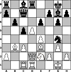 Partie-Notation im PGN-Format [Event "Nach dem Weltuntergang 2012"] [Site "www.mySchach.de"] [Date "2012.12.27"] [Round "1"] [White "brucybabe"] [Black "Duschgel"] [ECO "D86"] [WhitemyELO "1647"] [BlackmyELO "1617"] [Result "1-0"] [TimeControl "10/864000"] [WhiteDays "06"] [BlackDays "00"] [MySchachNr "85683"] 1. d4 Nf6 2. c4 g6 3. Nc3 d5 4. cxd5 Nxd5 5. e4 Nxc3 6. bxc3 Bg7 7. Bc4 c5 8. Ne2 O-O 9. O-O Qc7 10. Bb3 Rd8 11. Be3 Nc6 12. Qd2 e6 13. Rac1 b6 14. d5 Ne5 15. Rfd1 Ng4 16. g3 1-0 Stellungs-Notation im FEN-Format r1br2k1/p1q2pbp/1p2p1p1/2pP4/4P1n1/1BP1B1P1/P2QNP1P/2RR2K1 - - - 0 16 Geschlagene Figuren Weiss: Geschlagene Figuren Schwarz: Klicken Sie auf eine geschlagene Figur um den gewünschten Zug darzustellen!