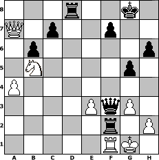 Partie-Notation im PGN-Format [Event "Schach f"] [Site "www.mySchach.de"] [Date "2008.08.25"] [Round "2"] [White "rakl"] [Black "bruno"] [ECO "D02"] [WhitemyELO "1754"] [BlackmyELO "1713"] [Result "0-1"] [TimeControl "10/2592000"] [WhiteDays "30"] [BlackDays "30"] [MySchachNr "47436"] 1. d4 d5 2. Nf3 h6 3. c4 Nf6 4. cxd5 e6 5. dxe6 Bxe6 6. Nc3 Bb4 7. a3 Bxc3+ 8. bxc3 Nc6 9. g3 O-O 10. Bg2 Re8 11. O-O Bd5 12. Rb1 b6 13. Re1 Qd6 14. Qa4 g5 15. c4 Be4 16. Be3 Bxb1 17. Rxb1 Rab8 18. d5 Ne5 19. Nd4 Neg4 20. Bd2 Ne4 21. Bxe4 Rxe4 22. Nb5 Qc5 23. e3 Rxc4 24. Qxa7 Rd8 25. a4 Qxd5 26. Be1 Nxe3 27. fxe3 Rc2 28. Bf2 Qf3 29. Rf1 Rxf2 0-1 Stellungs-Notation im FEN-Format 3r2k1/Q1p2p2/1p5p/1N4p1/P7/4PqP1/5r1P/5RK1 - - - 0 30 Geschlagene Figuren Weiss: Geschlagene Figuren Schwarz: Klicken Sie auf eine geschlagene Figur um den gewünschten Zug darzustellen!