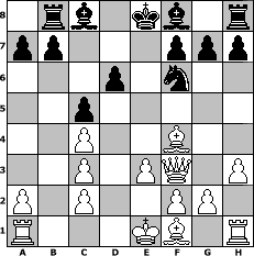 Partie-Notation im PGN-Format [Event "Wrixum-Open die V"] [Site "www.mySchach.de"] [Date "2008.11.17"] [Round "1"] [White "Rixdorfer"] [Black "Caligula"] [ECO "A20"] [WhitemyELO "1563"] [BlackmyELO "1395"] [Result "1-0"] [TimeControl "10/2592000"] [WhiteDays "52"] [BlackDays "59"] [MySchachNr "49902"] 1. c4 e5 2. Nf3 Nc6 3. Nc3 d6 4. d4 exd4 5. Nxd4 Nxd4 6. Qxd4 c5 7. Qe4+ Qe7 8. Qf3 Nf6 9. h3 Rb8 10. Bg5 Qe5 11. Bf4 Qd4 12. e3 Qxc3+ 13. bxc3 1-0 Stellungs-Notation im FEN-Format 1rb1kb1r/pp3ppp/3p1n2/2p5/2P2B2/2P1PQ1P/P1P2PP1/R3KB1R - KQk - 0 13 Geschlagene Figuren Weiss: Geschlagene Figuren Schwarz: Klicken Sie auf eine geschlagene Figur um den gewünschten Zug darzustellen!