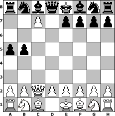 Partie-Notation im PGN-Format [Event "Trainingslager II"] [Site "www.mySchach.de"] [Date "2011.05.24"] [Round "2"] [White "Duschgel"] [Black "micha62"] [ECO "A10"] [WhitemyELO "1571"] [BlackmyELO "1165"] [Result "1-0"] [TimeControl "10/1728000"] [WhiteDays "20"] [BlackDays "00"] [MySchachNr "74143"] 1. c4 d5 2. cxd5 c5 3. dxc6 b5 4. Qc2 a5 5. c7 1-0 Stellungs-Notation im FEN-Format rnbqkbnr/2P1pppp/8/pp6/8/8/PPQPPPPP/RNB1KBNR - KQkq - 0 5 Geschlagene Figuren Weiss: Geschlagene Figuren Schwarz: Klicken Sie auf eine geschlagene Figur um den gewünschten Zug darzustellen!