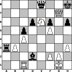 Partie-Notation im PGN-Format [Event "Schach dem Osterhasen IV"] [Site "www.mySchach.de"] [Date "2015.03.29"] [Round "1"] [White "faustballer"] [Black "Achimkogge"] [ECO "C24"] [WhitemyELO "1498"] [BlackmyELO "1494"] [Result "1-0"] [TimeControl "10/2592000"] [WhiteDays "150"] [BlackDays "147"] [MySchachNr "98713"] 1. e4 e5 2. Bc4 Nf6 3. Qf3 d6 4. h3 c6 5. d3 b5 6. Bb3 Na6 7. Bd2 Nc5 8. Bg5 Qa5+ 9. Bd2 Qb6 10. Bg5 Be7 11. Nd2 h6 12. Bh4 g5 13. Bg3 Nxb3 14. Nxb3 a5 15. Ne2 a4 16. Nd2 Qc5 17. c3 Be6 18. d4 exd4 19. Nxd4 Bd7 20. Qe3 b4 21. Rc1 O-O 22. O-O b3 23. axb3 axb3 24. N2xb3 Qb6 25. c4 c5 26. Nf5 Bxf5 27. exf5 Rfe8 28. Qd3 Nh5 29. Bh2 Qc6 30. Nd2 Nf4 31. Bxf4 gxf4 32. Rfe1 f6 33. Nf3 Ra2 34. b3 Kg7 35. Nh4 Ra3 36. Ng6 Bd8 37. Rxe8 Qxe8 38. Nxf4 Ba5 39. Ne6+ Kh8 40. Qg3 Bd2 41. Qg7# 1-0 Stellungs-Notation im FEN-Format 4q2k/6Q1/3pNp1p/2p2P2/2P5/rP5P/3b1PP1/2R3K1 - - - 6 41 Geschlagene Figuren Weiss: Geschlagene Figuren Schwarz: Klicken Sie auf eine geschlagene Figur um den gewünschten Zug darzustellen!