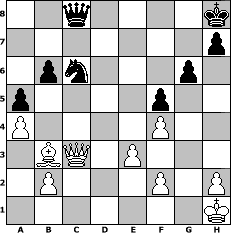 Partie-Notation im PGN-Format [Event "F"] [Site "www.mySchach.de"] [Date "2008.07.24"] [Round "1"] [White "Greenhorn"] [Black "Knight"] [ECO "E10"] [WhitemyELO "1621"] [BlackmyELO "1248"] [Result "1-0"] [TimeControl "10/1728000"] [WhiteDays "19"] [BlackDays "18"] [MySchachNr "46517"] 1. d4 Nf6 2. c4 e6 3. Nf3 d5 4. e3 Bb4+ 5. Nc3 O-O 6. Qc2 Nc6 7. Bd2 Bxc3 8. Bxc3 Ne4 9. Bd3 Nxc3 10. Qxc3 b6 11. O-O Bb7 12. Rac1 dxc4 13. Bxc4 a5 14. a4 Nb4 15. Bb3 Bxf3 16. gxf3 Rc8 17. Qd2 c5 18. Rc4 cxd4 19. Rxd4 Qc7 20. Rd7 Qb8 21. Kh1 Rfe8 22. Rd1 Nc6 23. Qe2 Ne5 24. R7d2 g6 25. f4 Nc6 26. Qb5 e5 27. Qd5 Qc7 28. Qf3 e4 29. Qe2 Rcd8 30. Qc4 Rxd2 31. Rxd2 Re7 32. Bc2 Rd7 33. Rxd7 Qxd7 34. Qxe4 f5 35. Bb3+ Kh8 36. Qc4 Qc8 37. Qc3+ 1-0 Stellungs-Notation im FEN-Format 2q4k/7p/1pn3p1/p4p2/P4P2/1BQ1P3/1P3P1P/7K - - - 5 37 Geschlagene Figuren Weiss: Geschlagene Figuren Schwarz: Klicken Sie auf eine geschlagene Figur um den gewünschten Zug darzustellen!