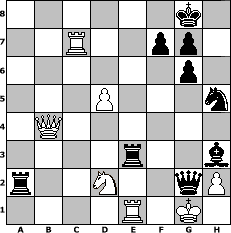 Partie-Notation im PGN-Format [Event "Sweety Tunier"] [Site "www.mySchach.de"] [Date "2006.02.28"] [Round "1"] [White "carlo"] [Black "icke"] [ECO "C23"] [WhitemyELO "1046"] [BlackmyELO "1355"] [Result "0-1"] [TimeControl "10/2592000"] [WhiteDays "112"] [BlackDays "108"] [MySchachNr "22936"] 1. e4 e5 2. Bc4 Qf6 3. c3 Bc5 4. f3 Qh4+ 5. g3 Bf2+ 6. Kxf2 Qh6 7. d3 Qb6+ 8. Kf1 Nf6 9. Qe1 d6 10. Be3 Qxb2 11. Nd2 Qxc3 12. Ne2 Qa5 13. a4 Bd7 14. Bb3 Bh3+ 15. Kf2 O-O 16. Rg1 Qb4 17. g4 Nc6 18. g5 Nh5 19. g6 hxg6 20. d4 exd4 21. Nxd4 Nxd4 22. Rb1 Ne6 23. Bd5 Qxa4 24. Rxb7 Rab8 25. Rxa7 Qc2 26. Qa1 Nef4 27. Qa2 Qd3 28. Re1 Nxd5 29. exd5 Rfe8 30. Rxc7 Ra8 31. Qc4 Qf5 32. Qc6 Ra2 33. Qxd6 Rxe3 34. Qb4 Qxf3+ 35. Kg1 Qg2# 0-1 Stellungs-Notation im FEN-Format 6k1/2R2pp1/6p1/3P3n/1Q6/4r2b/r2N2qP/4R1K1 - - - 2 36 Geschlagene Figuren Weiss: Geschlagene Figuren Schwarz: Klicken Sie auf eine geschlagene Figur um den gewünschten Zug darzustellen!