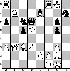 Partie-Notation im PGN-Format [Event "Dabei ist alles 3"] [Site "www.mySchach.de"] [Date "2008.05.14"] [Round "1"] [White "rakl"] [Black "Naunhofer"] [ECO "A04"] [WhitemyELO "1656"] [BlackmyELO "1690"] [Result "1-0"] [TimeControl "10/864000"] [WhiteDays "10"] [BlackDays "10"] [MySchachNr "44858"] 1. Nf3 c5 2. g3 b6 3. Bg2 Bb7 4. O-O Nf6 5. c4 e6 6. Nc3 Qc7 7. d3 Be7 8. Bf4 d6 9. a3 O-O 10. Nb5 Qd7 11. b4 a6 12. Nc3 h6 13. Rb1 g5 14. Bd2 d5 15. bxc5 bxc5 16. h4 Nh7 17. hxg5 hxg5 18. Ne5 Qc7 19. cxd5 exd5 20. Ng6 fxg6 21. Rxb7 Qe5 22. Nxd5 Nc6 23. Bc3 Qd6 24. Qb3 1-0 Stellungs-Notation im FEN-Format r4rk1/1R2b2n/p1nq2p1/2pN2p1/8/PQBP2P1/4PPB1/5RK1 - - - 4 24 Geschlagene Figuren Weiss: Geschlagene Figuren Schwarz: Klicken Sie auf eine geschlagene Figur um den gewünschten Zug darzustellen!
