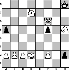 Partie-Notation im PGN-Format [Event "Blitz-"] [Site "www.mySchach.de"] [Date "2009.01.18"] [Round "1"] [White "sprinterde"] [Black "Ostseeboy"] [ECO "A02"] [WhitemyELO "1627"] [BlackmyELO "1312"] [Result "1-0"] [TimeControl "10/2592000"] [WhiteDays "150"] [BlackDays "148"] [MySchachNr "51739"] 1. f4 e5 2. fxe5 d6 3. exd6 Bxd6 4. Nf3 Nh6 5. d4 O-O 6. Bxh6 gxh6 7. Qd2 Bf5 8. Nc3 Bg6 9. e4 Nc6 10. Qxh6 Qf6 11. e5 Rae8 12. O-O-O Qg7 13. Qxg7+ Kxg7 14. exd6 cxd6 15. Bb5 a6 16. Bxc6 bxc6 17. Rde1 h5 18. Rxe8 Rxe8 19. Re1 Rh8 20. Nh4 Bh7 21. Kd2 Kh6 22. Re7 f5 23. Nf3 Rd8 24. Re6+ Kg7 25. Re7+ Kg8 26. Ra7 c5 27. d5 a5 28. Ng5 Bg6 29. Ne6 Re8 30. Rg7+ Kh8 31. Rxg6 Kh7 32. Rg7+ Kh6 33. Rd7 h4 34. Rxd6 Kh7 35. Nxc5 Rg8 36. Rf6 Rxg2+ 37. Ne2 Rxh2 38. d6 Rg2 39. d7 Rg5 40. d8=Q h3 41. Rf7+ Kg6 42. Nf4+ Kxf7 43. Qxg5 h2 44. Qg6+ Ke7 45. Qe6+ Kf8 46. Nd7+ Kg7 47. Nh5+ Kh8 48. Qf6+ 1-0 Stellungs-Notation im FEN-Format 7k/3N4/5Q2/p4p1N/8/8/PPPK1P1p/8 - - - 9 48 Geschlagene Figuren Weiss: Geschlagene Figuren Schwarz: Klicken Sie auf eine geschlagene Figur um den gewünschten Zug darzustellen!