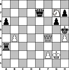 Partie-Notation im PGN-Format [Event "Es wird Fr"] [Site "www.mySchach.de"] [Date "2009.03.13"] [Round "2"] [White "espero"] [Black "UPS"] [ECO "D00"] [WhitemyELO "1500"] [BlackmyELO "1653"] [Result "1-0"] [TimeControl "10/2592000"] [WhiteDays "143"] [BlackDays "100"] [MySchachNr "53798"] 1. d4 d5 2. Bg5 Nc6 3. Nf3 f6 4. Bf4 e6 5. e3 Bd6 6. Bxd6 Qxd6 7. Qd2 Nge7 8. c4 b6 9. Nc3 O-O 10. Rc1 Bb7 11. cxd5 exd5 12. Bd3 a6 13. O-O Rad8 14. a3 Na5 15. Qc2 g6 16. Nd2 c5 17. dxc5 bxc5 18. Rfd1 Kg7 19. Na4 c4 20. Be2 Qc6 21. Nf3 Nb3 22. Nc3 d4 23. exd4 Nxc1 24. Qxc1 Rd6 25. Bf1 Rc8 26. h4 Nf5 27. Qf4 Rcd8 28. d5 Qb6 29. g4 Ne7 30. Bxc4 Bxd5 31. Bxd5 Nxd5 32. Nxd5 Rxd5 33. Rxd5 Rxd5 34. b4 Rd1+ 35. Kg2 Ra1 36. Qe4 Qa7 37. g5 Rxa3 38. gxf6+ Kxf6 39. Qe5+ Kf7 40. Ng5+ Kg8 41. Qe8+ Kg7 42. Qe5+ Kh6 43. Ne6 Qe7 44. Qf4+ Kh5 45. Ng7+ 1-0 Stellungs-Notation im FEN-Format 8/4q1Np/p5p1/7k/1P3Q1P/r7/5PK1/8 - - - 13 45 Geschlagene Figuren Weiss: Geschlagene Figuren Schwarz: Klicken Sie auf eine geschlagene Figur um den gewünschten Zug darzustellen!