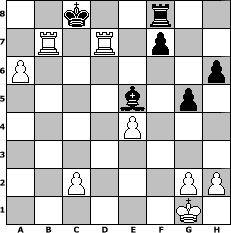 Partie-Notation im PGN-Format [Event "80 Jahre Weltmeister Max Euwe"] [Site "www.mySchach.de"] [Date "2015.07.20"] [Round "1"] [White "alibengali"] [Black "Joschi"] [ECO "A00"] [WhitemyELO "1685"] [BlackmyELO "1567"] [Result "1-0"] [TimeControl "10/2592000"] [WhiteDays "66"] [BlackDays "90"] [MySchachNr "99799"] 1. Nc3 d5 2. d4 Nf6 3. Bg5 Bf5 4. f3 h6 5. Bh4 g5 6. Bg3 c6 7. e3 Nbd7 8. Bd3 Bxd3 9. Qxd3 Bg7 10. Nge2 Qb6 11. O-O O-O-O 12. e4 dxe4 13. fxe4 Rhf8 14. a4 a5 15. b4 axb4 16. Rfb1 e5 17. a5 Qa7 18. Rxb4 exd4 19. Nxd4 Nc5 20. Ncb5 cxb5 21. Nxb5 Nxd3+ 22. Nxa7+ Kd7 23. Rxb7+ Ke8 24. Nc6 Nd7 25. Rd1 N3e5 26. Nxd8 Kxd8 27. Bxe5 Bxe5 28. Rdxd7+ Kc8 29. a6 1-0 Stellungs-Notation im FEN-Format 2k2r2/1R1R1p2/P6p/4b1p1/4P3/8/2P3PP/6K1 - - - 0 29 Geschlagene Figuren Weiss: Geschlagene Figuren Schwarz: Klicken Sie auf eine geschlagene Figur um den gewünschten Zug darzustellen!