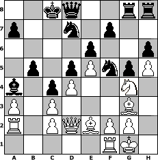 Partie-Notation im PGN-Format [Event "1. Mannschaftsturnier 2004"] [Site "www.mySchach.de"] [Date "2004.11.16"] [Round "2"] [Board "2"] [White "helrobe"] [Black "myfairlady"] [ECO "C18"] [WhitemyELO "1778"] [BlackmyELO "1884"] [Result "1/2-1/2"] [TimeControl "10/2592000"] [WhiteDays "68"] [BlackDays "83"] [MySchachNr "8084"] 1. e4 e6 2. d4 d5 3. Nc3 Bb4 4. e5 c5 5. a3 Bxc3+ 6. bxc3 Qc7 7. Nf3 Bd7 8. Be2 Ba4 9. Bd3 c4 10. Be2 Ne7 11. O-O Nd7 12. Bg5 Nc6 13. Qd2 b5 14. h4 h6 15. Bf4 O-O-O 16. Ra2 Rdg8 17. h5 Qd8 18. Bg3 g5 19. Nh2 Ne7 20. Ng4 Nf5 1/2-1/2 Stellungs-Notation im FEN-Format 2kq2rr/p2n1p2/4p2p/1p1pPnpP/b1pP2N1/P1P3B1/R1PQBPP1/5RK1 - - - 4 21 Geschlagene Figuren Weiss: Geschlagene Figuren Schwarz: Klicken Sie auf eine geschlagene Figur um den gewünschten Zug darzustellen!