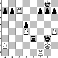 Partie-Notation im PGN-Format [Event "Affenbande"] [Site "www.mySchach.de"] [Date "2010.02.25"] [Round "1"] [White "rikilatic"] [Black "martinus"] [ECO "A00"] [WhitemyELO "1410"] [BlackmyELO "1759"] [Result "0-1"] [TimeControl "10/864000"] [WhiteDays "40"] [BlackDays "39"] [MySchachNr "63560"] 1. b4 e5 2. Bb2 Bxb4 3. Bxe5 Nf6 4. e3 Nc6 5. Bxf6 Qxf6 6. c3 O-O 7. Qf3 Be7 8. d4 Qg6 9. Nh3 Qc2 10. Qd1 Qb2 11. Nd2 Qxc3 12. Rc1 Qa5 13. Qb3 Bb4 14. Rc2 Re8 15. Be2 d6 16. Ng5 Bxd2+ 17. Rxd2 Qxg5 18. Bf3 Na5 19. Qc3 Be6 20. h4 Qb5 21. Be2 Bc4 22. Bxc4 Nxc4 23. Rc2 d5 24. O-O Re4 25. g3 Qb6 26. Kg2 Qg6 27. Qd3 Rae8 28. Qb3 Nxe3+ 29. fxe3 Rxe3 30. Qxe3 Rxe3 31. Rxc7 Qxg3+ 0-1 Stellungs-Notation im FEN-Format 6k1/ppR2ppp/8/3p4/3P3P/4r1q1/P5K1/5R2 - - - 0 32 Geschlagene Figuren Weiss: Geschlagene Figuren Schwarz: Klicken Sie auf eine geschlagene Figur um den gewünschten Zug darzustellen!