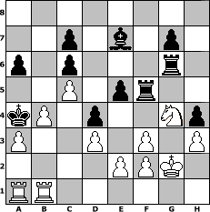 Partie-Notation im PGN-Format [Event "Es wird bald Sommer"] [Site "www.mySchach.de"] [Date "2015.05.12"] [Round "1"] [White "SEO1957"] [Black "Schefsche"] [ECO "C60"] [WhitemyELO "1553"] [BlackmyELO "1452"] [Result "1/2-1/2"] [TimeControl "10/2592000"] [WhiteDays "27"] [BlackDays "30"] [MySchachNr "99218"] 1. e4 e5 2. Nf3 Nc6 3. Bb5 Qf6 4. O-O a6 5. Bxc6 bxc6 6. d3 h6 7. a3 d5 8. Re1 d4 9. c3 Bg4 10. Nbd2 O-O-O 11. c4 h5 12. Nf1 Bxf3 13. Qxf3 Qxf3 14. gxf3 h4 15. h3 Rd6 16. Kh1 Rh5 17. Nh2 Nh6 18. Bxh6 Rdxh6 19. Ng4 Rg6 20. Rg1 Kb7 21. b4 Kb6 22. c5+ Kb5 23. Rgb1 Ka4 24. Kg1 f5 25. exf5 Rxf5 26. Kg2 Be7 1/2-1/2 Stellungs-Notation im FEN-Format 8/2p1b1p1/p1p3r1/2P1pr2/kP1p2Np/P2P1P1P/4PPK1/RR6 - - - 2 27 Geschlagene Figuren Weiss: Geschlagene Figuren Schwarz: Klicken Sie auf eine geschlagene Figur um den gewünschten Zug darzustellen!