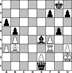 Partie-Notation im PGN-Format [Event "JN OPEN 40/10 1"] [Site "www.mySchach.de"] [Date "2016.01.25"] [Round "1"] [White "Joschi"] [Black "Steffi"] [ECO "C65"] [WhitemyELO "1527"] [BlackmyELO "1558"] [Result "0-1"] [TimeControl "10/3456000"] [WhiteDays "40"] [BlackDays "40"] [MySchachNr "102204"] 1. e4 e5 2. Nf3 Nc6 3. Bb5 Nf6 4. O-O a6 5. Ba4 b5 6. Bb3 Be7 7. Re1 O-O 8. c3 d6 9. d4 Bb7 10. a3 Na5 11. Bc2 Re8 12. Nbd2 c5 13. dxe5 dxe5 14. Nxe5 Bd6 15. Nef3 Qc7 16. h3 Nd7 17. b4 cxb4 18. cxb4 Nc6 19. Bb2 Rac8 20. Bb3 Nce5 21. Rc1 Qb8 22. Nxe5 Bxe5 23. Bxe5 Nxe5 24. Rxc8 Rxc8 25. f4 Nd3 26. Rf1 Nxf4 27. Qf3 g5 28. g3 Qa7+ 29. Kh2 Qd4 30. Rf2 Rc3 31. gxf4 Rxf3 32. Rxf3 Qxd2+ 33. Kg3 Qe1+ 34. Kh2 Bxe4 0-1 Stellungs-Notation im FEN-Format 6k1/5p1p/p7/1p4p1/1P2bP2/PB3R1P/4P2K/4q3 - - - 0 35 Geschlagene Figuren Weiss: ![]() ![]() ![]() ![]() ![]() ![]() ![]() ![]() ![]() ![]() ![]() ![]() ![]() ![]() ![]() Geschlagene Figuren Schwarz: ![]() ![]() ![]() ![]() ![]() ![]() ![]() ![]() ![]() ![]() ![]() ![]() ![]() ![]() ![]() Klicken Sie auf eine geschlagene Figur um den gewünschten Zug darzustellen!