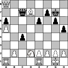 Partie-Notation im PGN-Format [Event "M"] [Site "www.mySchach.de"] [Date "2013.02.24"] [Round "1"] [White "martinus"] [Black "Gauss1233"] [ECO "B01"] [WhitemyELO "1729"] [BlackmyELO "1435"] [Result "1-0"] [TimeControl "10/3456000"] [WhiteDays "40"] [BlackDays "37"] [MySchachNr "86767"] 1. e4 d5 2. e5 e6 3. d4 c5 4. Nf3 a6 5. c3 cxd4 6. Nxd4 Nc6 7. Nxc6 bxc6 8. Bd3 c5 9. O-O Ne7 10. Be3 g6 11. Bxc5 Bg7 12. Bd4 Nc6 13. Bc5 Nxe5 14. Bc2 Nd7 15. Ba3 Qc7 16. Re1 Nb6 17. Nd2 Bf6 18. Qf3 Be7 19. Bxe7 Qxe7 20. c4 Bb7 21. Qc3 dxc4 22. Qxh8+ Qf8 23. Qd4 Qb4 24. Bb3 Bd5 25. a3 Qb5 26. Bc2 h5 27. a4 Qc6 28. a5 Nd7 29. Ba4 Qc7 30. Qxd5 Kf8 31. Qxa8+ Kg7 32. Bxd7 1-0 Stellungs-Notation im FEN-Format Q7/2qB1pk1/p3p1p1/P6p/2p5/8/1P1NPPPP/R3R1K1 - - - 0 32 Geschlagene Figuren Weiss: Geschlagene Figuren Schwarz: Klicken Sie auf eine geschlagene Figur um den gewünschten Zug darzustellen!