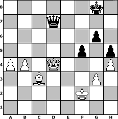 Partie-Notation im PGN-Format [Event "Turnier in den M"] [Site "www.mySchach.de"] [Date "2014.02.19"] [Round "1"] [White "Andylein1989"] [Black "Winston"] [ECO "B28"] [WhitemyELO "1339"] [BlackmyELO "1450"] [Result "1-0"] [TimeControl "10/2592000"] [WhiteDays "30"] [BlackDays "30"] [MySchachNr "93104"] 1. e4 c5 2. Nf3 a6 3. d4 cxd4 4. Nxd4 e5 5. Nf3 Nc6 6. Nc3 Bb4 7. Bd2 Ba5 8. a3 Bb6 9. Bc4 Nf6 10. O-O h6 11. Nd5 Nxd5 12. Bxd5 O-O 13. Bc3 d6 14. Nd2 Qg5 15. Kh1 Kh8 16. Nc4 Bc7 17. Qf3 Bd7 18. Rad1 Rac8 19. Bxc6 Bxc6 20. Nxd6 Bxd6 21. Rxd6 Rcd8 22. Rxd8 Rxd8 23. Re1 Qe7 24. h3 f6 25. Bb4 Qe6 26. b3 Qe8 27. Ba5 Rd7 28. Qe3 Qg6 29. Kh2 Qf7 30. c4 Re7 31. f3 Re8 32. Rd1 Kh7 33. Qb6 Qh5 34. Qc7 Bxe4 35. Rd7 Rg8 36. fxe4 b5 37. cxb5 axb5 38. Qc6 Qh4 39. g3 Qg5 40. Bd2 Qg6 41. Rb7 Rd8 42. Rd7 Rxd7 43. Qxd7 Qxe4 44. Qxb5 Qc2 45. Qb4 e4 46. Qc3 Qd1 47. Qe3 f5 48. b4 Qa4 49. Qf4 Qd7 50. h4 h5 51. Qg5 g6 52. Bc3 Qa7 53. Kg2 e3 54. Kf3 e2 55. Kxe2 Qa6+ 56. Kf2 Qa7+ 57. Qe3 Qd7 58. a4 Kg8 59. Qd4 1-0 Stellungs-Notation im FEN-Format 6k1/3q4/6p1/5p1p/PP1Q3P/2B3P1/5K2/8 - - - 2 59 Geschlagene Figuren Weiss: Geschlagene Figuren Schwarz: Klicken Sie auf eine geschlagene Figur um den gewünschten Zug darzustellen!