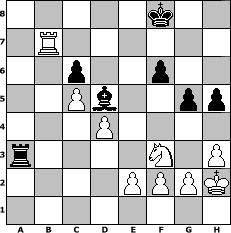 Partie-Notation im PGN-Format [Event "Dann mal los"] [Site "www.mySchach.de"] [Date "2006.09.24"] [Round "1"] [White "ujack1961"] [Black "richym3"] [ECO "C54"] [WhitemyELO "1816"] [BlackmyELO "1516"] [Result "1/2-1/2"] [TimeControl "10/864000"] [WhiteDays "40"] [BlackDays "36"] [MySchachNr "28850"] 1. e4 e5 2. Nf3 Nc6 3. Bc4 Bc5 4. c3 Nf6 5. d3 O-O 6. O-O Be7 7. b4 d6 8. a4 a6 9. h3 d5 10. exd5 Nxd5 11. Re1 Bf6 12. Ba3 Re8 13. Qc2 Be6 14. Nbd2 e4 15. Nxe4 Be7 16. b5 axb5 17. Bxb5 Bd7 18. Qb3 Nb6 19. Bxe7 Rxe7 20. Nc5 Na5 21. Qb4 Rxe1+ 22. Rxe1 c6 23. Bc4 Nbxc4 24. dxc4 Bc8 25. Ne4 Be6 26. c5 Qd3 27. Qd4 Qxd4 28. cxd4 Nc4 29. Nc3 Nb2 30. Ra1 f6 31. Kh2 h5 32. Rb1 Nxa4 33. Nxa4 Rxa4 34. Rxb7 g5 35. Re7 Bd5 36. Kg3 Kf8 37. Rb7 Ra3 38. Kh2 1/2-1/2 Stellungs-Notation im FEN-Format 5k2/1R6/2p2p2/2Pb2pp/3P4/r4N1P/4PPPK/8 - - - 7 38 Geschlagene Figuren Weiss: Geschlagene Figuren Schwarz: Klicken Sie auf eine geschlagene Figur um den gewünschten Zug darzustellen!