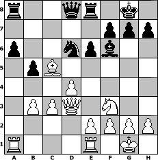 Partie-Notation im PGN-Format [Event "guinan"] [Site "www.mySchach.de"] [Date "2010.05.17"] [Round "1"] [White "guinan"] [Black "Scully"] [ECO "B28"] [WhitemyELO "1671"] [BlackmyELO "1545"] [Result "1/2-1/2"] [TimeControl "10/2592000"] [WhiteDays "40"] [BlackDays "46"] [MySchachNr "65584"] 1. e4 c5 2. Nf3 a6 3. c3 d5 4. exd5 Qxd5 5. d4 e6 6. Bd3 c4 7. Bc2 b5 8. Nbd2 Ra7 9. O-O Nf6 10. Re1 Bb7 11. b3 cxb3 12. axb3 Qd8 13. Bd3 Nc6 14. Ne4 Be7 15. Bb2 O-O 16. Nxf6+ Bxf6 17. Be4 Na5 18. Bxb7 Nxb7 19. Ba3 Re8 20. Qd3 Nd6 21. Bc5 Ra8 1/2-1/2 Stellungs-Notation im FEN-Format r2qr1k1/5ppp/p2npb2/1pB5/3P4/1PPQ1N2/4PPPP/R3R1K1 - - - 6 22 Geschlagene Figuren Weiss: ![]() ![]() ![]() ![]() ![]() ![]() ![]() ![]() ![]() ![]() ![]() ![]() ![]() ![]() ![]() Geschlagene Figuren Schwarz: ![]() ![]() ![]() ![]() ![]() ![]() ![]() ![]() ![]() ![]() ![]() ![]() ![]() ![]() ![]() Klicken Sie auf eine geschlagene Figur um den gewünschten Zug darzustellen!