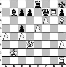 Partie-Notation im PGN-Format [Event "Neujahr 2019"] [Site "www.mySchach.de"] [Date "2018.12.27"] [Round "1"] [White "Grubengeist"] [Black "Lohl"] [ECO "C45"] [WhitemyELO "2034"] [BlackmyELO "1825"] [Result "1-0"] [TimeControl "10/2592000"] [WhiteDays "111"] [BlackDays "114"] [MySchachNr "113858"] 1. e4 e5 2. Nf3 Nc6 3. d4 exd4 4. Nxd4 Nf6 5. Nxc6 bxc6 6. e5 Qe7 7. Qe2 Nd5 8. c4 Nb6 9. Nc3 Qe6 10. Bd2 Be7 11. O-O-O Ba6 12. b3 O-O 13. f4 f5 14. Qe3 Bb7 15. Bd3 a5 16. g4 fxg4 17. h3 g3 18. Qxg3 a4 19. Rdg1 Qf7 20. f5 axb3 21. axb3 Bb4 22. Bh6 Bxc3 23. Bxg7 Rfe8 24. Bh6+ Kh8 25. f6 Ra1+ 26. Kc2 Ra2+ 27. Kxc3 Na4+ 28. bxa4 Ra3+ 29. Kb2 Rxd3 30. Qxd3 c5 31. Rg7 1-0 Stellungs-Notation im FEN-Format 4r2k/1bpp1qRp/5P1B/2p1P3/P1P5/3Q3P/1K6/7R - - - 1 31 Geschlagene Figuren Weiss: Geschlagene Figuren Schwarz: Klicken Sie auf eine geschlagene Figur um den gewünschten Zug darzustellen!