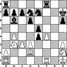 Partie-Notation im PGN-Format [Event "Spring 2017"] [Site "www.mySchach.de"] [Date "2017.03.21"] [Round "1"] [White "shan"] [Black "espero"] [ECO "A00"] [WhitemyELO "1308"] [BlackmyELO "1861"] [Result "0-1"] [TimeControl "10/2592000"] [WhiteDays "58"] [BlackDays "59"] [MySchachNr "107449"] 1. g3 e5 2. Bg2 Nf6 3. e4 Bc5 4. d3 h6 5. Nf3 Nc6 6. O-O d6 7. c3 O-O 8. Nh4 Bg4 9. Bf3 Bxf3 10. Qxf3 Kh7 11. b4 Bb6 12. Nd2 Ne7 13. Nb3 Qd7 14. Bd2 Qg4 15. Qxg4 Nxg4 16. h3 Nf6 17. Nf3 g5 18. Nh2 Nd7 19. Kh1 f5 20. f4 gxf4 21. gxf4 fxe4 0-1 Stellungs-Notation im FEN-Format r4r2/pppnn2k/1b1p3p/4p3/1P2pP2/1NPP3P/P2B3N/R4R1K - - - 0 22 Geschlagene Figuren Weiss: Geschlagene Figuren Schwarz: Klicken Sie auf eine geschlagene Figur um den gewünschten Zug darzustellen!