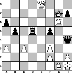 Partie-Notation im PGN-Format [Event "Tunier der Schlusslichter"] [Site "www.mySchach.de"] [Date "2010.09.08"] [Round "1"] [White "Caligula"] [Black "Knight"] [ECO "C02"] [WhitemyELO "1357"] [BlackmyELO "1175"] [Result "1-0"] [TimeControl "10/2592000"] [WhiteDays "30"] [BlackDays "29"] [MySchachNr "68205"] 1. e4 e6 2. d4 d5 3. e5 c5 4. Nf3 c4 5. Nc3 Ne7 6. b3 Nbc6 7. bxc4 g6 8. cxd5 exd5 9. Bb5 a6 10. Ba4 Bg7 11. O-O b5 12. Bb3 O-O 13. Bg5 f6 14. exf6 Bxf6 15. a3 Bg4 16. Bxf6 Rxf6 17. Qd3 Bxf3 18. gxf3 Nf5 19. Ne2 Rb8 20. Nf4 Qd6 21. Nxd5 Re6 22. Nf4 Qxf4 23. Bxe6+ Kh8 24. Bxf5 gxf5 25. c3 Rg8+ 26. Kh1 Rg6 27. Rg1 Rh6 28. Rg3 Qh4 29. Rg2 Ne7 30. d5 Rd6 31. Qe3 Rxd5 32. Rag1 Ng6 33. Qe8+ Kg7 34. Rxg6+ 1-0 Stellungs-Notation im FEN-Format 4Q3/6kp/p5R1/1p1r1p2/7q/P1P2P2/5P1P/6RK - - - 0 34 Geschlagene Figuren Weiss: Geschlagene Figuren Schwarz: Klicken Sie auf eine geschlagene Figur um den gewünschten Zug darzustellen!