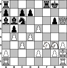 Partie-Notation im PGN-Format [Event "Prignitz- Turnier 2011"] [Site "www.mySchach.de"] [Date "2011.07.19"] [Round "1"] [White "espero"] [Black "Knight"] [ECO "C33"] [WhitemyELO "1637"] [BlackmyELO "1091"] [Result "1-0"] [TimeControl "10/2592000"] [WhiteDays "88"] [BlackDays "90"] [MySchachNr "75192"] 1. e4 e5 2. f4 exf4 3. Bc4 Qh4+ 4. Kf1 Nf6 5. Nf3 Qh5 6. Nc3 Bc5 7. d4 Bb4 8. e5 Ne4 9. Nxe4 Nc6 10. c3 Ba5 11. Bxf4 O-O 12. h3 b6 13. Bd3 Bb7 14. Ng3 Qg6 15. Bxg6 fxg6 16. Qd2 Ba6+ 17. Kg1 b5 18. b4 Bb6 19. Kh2 h6 20. Bxh6 gxh6 21. Qxh6 1-0 Stellungs-Notation im FEN-Format r4rk1/p1pp4/bbn3pQ/1p2P3/1P1P4/2P2NNP/P3P1PK/R6R - - - 0 21 Geschlagene Figuren Weiss: Geschlagene Figuren Schwarz: Klicken Sie auf eine geschlagene Figur um den gewünschten Zug darzustellen!
