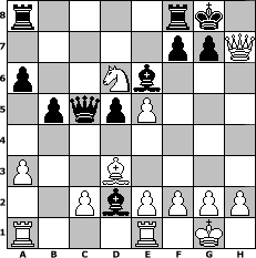 Partie-Notation im PGN-Format [Event "Sommertag"] [Site "www.mySchach.de"] [Date "2007.08.08"] [Round "2"] [White "lure"] [Black "TAR"] [ECO "C43"] [WhitemyELO "1486"] [BlackmyELO "1302"] [Result "1-0"] [TimeControl "10/864000"] [WhiteDays "10"] [BlackDays "07"] [MySchachNr "37099"] 1. e4 e5 2. Nf3 Nf6 3. d4 Nxe4 4. Bd3 d5 5. dxe5 Nd7 6. O-O Be7 7. Bf4 O-O 8. Re1 Ndc5 9. b4 Ne6 10. Bd2 Nxd2 11. Qxd2 Ng5 12. Nxg5 Bxg5 13. Qd1 Qe7 14. Nc3 Be6 15. a3 c5 16. bxc5 Qxc5 17. Nb5 a6 18. Nd6 b5 19. Qh5 Bd2 20. Qxh7# 1-0 Stellungs-Notation im FEN-Format r4rk1/5ppQ/p2Nb3/1pqpP3/8/P2B4/2PbPPPP/R3R1K1 - - - 0 20 Geschlagene Figuren Weiss: Geschlagene Figuren Schwarz: Klicken Sie auf eine geschlagene Figur um den gewünschten Zug darzustellen!