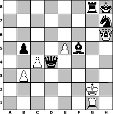 Partie-Notation im PGN-Format [Event "?"] [Site "www.mySchach.de"] [Date "2025.10.13"] [Round "?"] [White "Winston"] [Black "Seneca"] [ECO "B07"] [WhitemyELO "1531"] [BlackmyELO "1515"] [Result "0-1"] [TimeControl "10/2592000"] [WhiteDays "30"] [BlackDays "30"] [MySchachNr "133734"] 1. e4 d6 2. h3 Nf6 3. Nc3 c6 4. Nf3 g6 5. d3 Bg7 6. Be3 O-O 7. Qd2 a6 8. Be2 b5 9. a3 Bb7 10. Bh6 e5 11. Bxg7 Kxg7 12. O-O-O Nbd7 13. Nh2 Nb6 14. f4 h6 15. fxe5 dxe5 16. g4 Nh7 17. Nf3 f6 18. h4 a5 19. g5 h5 20. gxf6+ Rxf6 21. Rhg1 Bc8 22. Nxe5 Qd6 23. d4 Nd7 24. Bxh5 Nxe5 25. Bxg6 Rxg6 26. Rxg6+ Nxg6 27. Rg1 b4 28. Nb1 Kh8 29. e5 Qe7 30. Rxg6 Qxh4 31. Rg1 Bf5 32. b3 Qe7 33. Kb2 bxa3+ 34. Nxa3 Rb8 35. Qxa5 Qf8 36. Nc4 Ra8 37. Qd2 Be6 38. Nd6 Qe7 39. c4 Qa7 40. Qe3 Qa2+ 41. Kc3 Rb8 42. Nb5 cxb5 43. Qh6 Qa5+ 44. Kd3 Bf5+ 45. Ke3 Qc3+ 46. Kf2 Qxd4+ 47. Kg2 Rg8+ 0-1 Stellungs-Notation im FEN-Format 6rk/7n/7Q/1p2Pb2/2Pq4/1P6/6K1/6R1 - - - 2 48 Geschlagene Figuren Weiss: Geschlagene Figuren Schwarz: Klicken Sie auf eine geschlagene Figur um den gewünschten Zug darzustellen!