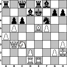 Partie-Notation im PGN-Format [Event "Abermals Aljechin"] [Site "www.mySchach.de"] [Date "2011.02.13"] [Round "1"] [White "woern63"] [Black "Svetlana"] [ECO "A52"] [WhitemyELO "1845"] [BlackmyELO "1586"] [Result "1-0"] [TimeControl "10/1728000"] [WhiteDays "60"] [BlackDays "42"] [MySchachNr "71979"] 1. d4 Nf6 2. c4 e5 3. dxe5 Ng4 4. e4 d6 5. Be2 Nxe5 6. f4 Nec6 7. Nf3 Be7 8. Nc3 O-O 9. O-O Nd7 10. Be3 Nf6 11. h3 Re8 12. Qc2 Nh5 13. Kh2 Nf6 14. Rad1 Bd7 15. a3 Bf8 16. Bf2 a6 17. b4 b6 18. b5 axb5 19. cxb5 Ne7 20. a4 Ng6 21. f5 Ne5 22. Nxe5 Rxe5 23. Bc4 c6 24. Bd4 Re8 25. e5 dxe5 26. Bxf7+ Kxf7 27. Qb3+ Ke7 28. Bxe5 Qc8 29. Rfe1 1-0 Stellungs-Notation im FEN-Format r1q1rb2/3bk1pp/1pp2n2/1P2BP2/P7/1QN4P/3P2PK/3RR3 - - - 2 29 Geschlagene Figuren Weiss: Geschlagene Figuren Schwarz: Klicken Sie auf eine geschlagene Figur um den gewünschten Zug darzustellen!