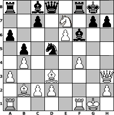 Partie-Notation im PGN-Format [Event "Orang - Utan"] [Site "www.mySchach.de"] [Date "2012.03.06"] [Round "1"] [White "espero"] [Black "OwainGwynedd"] [ECO "A00"] [WhitemyELO "1620"] [BlackmyELO "1417"] [Result "1-0"] [TimeControl "10/2592000"] [WhiteDays "90"] [BlackDays "63"] [MySchachNr "80368"] 1. b4 d5 2. Bb2 Bd7 3. e3 b5 4. Nf3 Nf6 5. Nc3 e6 6. Ne5 a6 7. a3 Bd6 8. f4 d4 9. exd4 O-O 10. Bd3 Nc6 11. Ne2 Be8 12. O-O Be7 13. Qe1 Nd5 14. Qg3 f6 15. Qh3 f5 16. g4 Nxe5 17. dxe5 Bc6 18. Nd4 Bd7 19. gxf5 exf5 20. e6 Bc8 21. Nxf5 Bf6 22. Ne7+ 1-0 Stellungs-Notation im FEN-Format r1bq1rk1/2p1N1pp/p3Pb2/1p1n4/1P3P2/P2B3Q/1BPP3P/R4RK1 - - - 2 22 Geschlagene Figuren Weiss: Geschlagene Figuren Schwarz: Klicken Sie auf eine geschlagene Figur um den gewünschten Zug darzustellen!