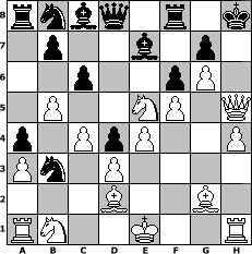 Partie-Notation im PGN-Format [Event "D.A. - Schnell 1"] [Site "www.mySchach.de"] [Date "2008.06.09"] [Round "1"] [White "BobbyF4"] [Black "Caligula"] [ECO "A00"] [WhitemyELO "1553"] [BlackmyELO "1484"] [Result "1-0"] [TimeControl "10/864000"] [WhiteDays "10"] [BlackDays "10"] [MySchachNr "45503"] 1. g4 d5 2. Bg2 e6 3. d3 e5 4. e4 d4 5. h4 Nf6 6. g5 Nfd7 7. f4 Nc6 8. f5 Be7 9. a3 O-O 10. Nf3 f6 11. g6 h6 12. c3 Nc5 13. b4 Nd7 14. Qb3+ Kh8 15. c4 a6 16. Bd2 a5 17. b5 a4 18. Qd1 Ncb8 19. Qc1 c6 20. Bxh6 Rg8 21. Bd2 Nc5 22. Qd1 Nb3 23. Nxe5 Rf8 24. Qh5+ 1-0 Stellungs-Notation im FEN-Format rnbq1r1k/1p2b1p1/2p2pP1/1P2NP1Q/p1PpP2P/Pn1P4/3B2B1/RN2K2R - KQ - 2 24 Geschlagene Figuren Weiss: Geschlagene Figuren Schwarz: Klicken Sie auf eine geschlagene Figur um den gewünschten Zug darzustellen!