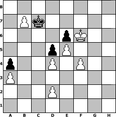 Partie-Notation im PGN-Format [Event "Es wird Fr"] [Site "www.mySchach.de"] [Date "2009.03.13"] [Round "1"] [White "werderfan"] [Black "Master1"] [ECO "D10"] [WhitemyELO "1510"] [BlackmyELO "1618"] [Result "1-0"] [TimeControl "10/2592000"] [WhiteDays "180"] [BlackDays "178"] [MySchachNr "53685"] 1. d4 d5 2. c4 c6 3. Nc3 Nf6 4. cxd5 cxd5 5. Bg5 Nc6 6. e3 e6 7. Nf3 Be7 8. Bb5 Bd7 9. O-O O-O 10. Re1 a6 11. Ba4 Bb4 12. a3 Bxc3 13. bxc3 b5 14. Bc2 a5 15. Qb1 Na7 16. Bxh7+ Kh8 17. Ne5 g6 18. Bxg6 fxg6 19. Nxg6+ Kg7 20. Nxf8 Qxf8 21. Bxf6+ Kxf6 22. e4 Bc6 23. e5+ Ke7 24. Qh7+ Qf7 25. Qh4+ Kd7 26. Re3 Rf8 27. Rf3 Qe8 28. Rxf8 Qxf8 29. Qh7+ Qe7 30. Qxe7+ Kxe7 31. g4 Kf7 32. h4 Kg6 33. Kg2 Nc8 34. Rh1 Ne7 35. f4 Be8 36. h5+ Kh6 37. Kg3 a4 38. Kh4 Bf7 39. g5+ Kh7 40. g6+ Bxg6 41. hxg6+ Nxg6+ 42. Kg5+ Kg7 43. Rb1 Ne7 44. Rxb5 Nc6 45. Rb4 Nxb4 46. cxb4 Kf7 47. b5 Ke7 48. b6 Kd7 49. b7 Kc7 50. Kf6 1-0 Stellungs-Notation im FEN-Format 8/1Pk5/4pK2/3pP3/p2P1P2/P7/3P4/8 - - - 2 50 Geschlagene Figuren Weiss: Geschlagene Figuren Schwarz: Klicken Sie auf eine geschlagene Figur um den gewünschten Zug darzustellen!