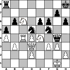 Partie-Notation im PGN-Format [Event "Pfingsturnier"] [Site "www.mySchach.de"] [Date "2019.05.31"] [Round "1"] [White "pepo47"] [Black "Helmut48"] [ECO "E47"] [WhitemyELO "2125"] [BlackmyELO "2079"] [Result "1-0"] [TimeControl "10/2592000"] [WhiteDays "113"] [BlackDays "110"] [MySchachNr "115109"] 1. d4 Nf6 2. c4 e6 3. Nc3 Bb4 4. e3 O-O 5. Bd3 c5 6. Nf3 d5 7. O-O cxd4 8. exd4 dxc4 9. Bxc4 b6 10. Bg5 Bb7 11. Rc1 h6 12. Bh4 Nc6 13. Re1 Rc8 14. Bd3 Be7 15. a3 Nh5 16. Bxe7 Nxe7 17. Be4 Bxe4 18. Nxe4 Nf4 19. Nc3 Nfd5 20. Qd3 Nf5 21. g3 Qd6 22. Ne4 Qb8 23. b3 Rxc1 24. Rxc1 a5 25. Ne5 Qb7 26. Rc4 f6 27. Nc6 Rc8 28. Qc2 Ra8 29. a4 Qf7 30. Qd3 Qd7 31. Qc2 Kh8 32. Qc1 Qf7 33. Qd1 Qe8 34. Qc2 Qh5 35. Qd3 Qg4 36. f3 1-0 Stellungs-Notation im FEN-Format r6k/6p1/1pN1pp1p/p2n1n2/P1RPN1q1/1P1Q1PP1/3P3P/6K1 - - - 0 36 Geschlagene Figuren Weiss: Geschlagene Figuren Schwarz: Klicken Sie auf eine geschlagene Figur um den gewünschten Zug darzustellen!