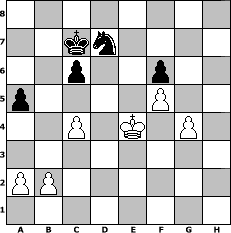 Partie-Notation im PGN-Format [Event "6. Wikinger-Meisterschaft Vorrunde A"] [Site "www.mySchach.de"] [Date "2010.04.08"] [Round "1"] [White "Haneken"] [Black "werderfan"] [ECO "C42"] [WhitemyELO "1449"] [BlackmyELO "1520"] [Result "1/2-1/2"] [TimeControl "10/2592000"] [WhiteDays "16"] [BlackDays "30"] [MySchachNr "64643"] 1. e4 e5 2. Nf3 Nf6 3. Nxe5 d6 4. Nc4 Nxe4 5. d3 Nf6 6. Nc3 Nc6 7. Bf4 Bg4 8. Be2 Bxe2 9. Qxe2+ Qe7 10. Ne4 Nxe4 11. dxe4 O-O-O 12. O-O-O Qf6 13. Qg4+ Kb8 14. Bg5 Qg6 15. h3 Be7 16. Bxe7 Qxg4 17. hxg4 Nxe7 18. Ne3 Nc6 19. Kd2 h6 20. Kc3 Ne5 21. f4 Ng6 22. g3 Rhe8 23. Nf5 Rxe4 24. Nxg7 Re3+ 25. Rd3 Rxd3+ 26. Kxd3 Rg8 27. Nf5 c5 28. Nxd6 Rd8 29. Kc4 Rxd6 30. f5 Ne5+ 31. Kxc5 Rc6+ 32. Kd4 Nxg4 33. Rh4 Nf6 34. Rxh6 Nd7 35. Rxc6 bxc6 36. g4 f6 37. c4 Kc7 38. Ke4 a5 1/2-1/2 Stellungs-Notation im FEN-Format 8/2kn4/2p2p2/p4P2/2P1K1P1/8/PP6/8 - - - 0 39 Geschlagene Figuren Weiss: Geschlagene Figuren Schwarz: Klicken Sie auf eine geschlagene Figur um den gewünschten Zug darzustellen!