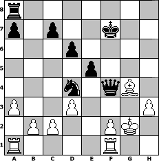 Partie-Notation im PGN-Format [Event "Bobby Fischer lebt"] [Site "www.mySchach.de"] [Date "2009.07.29"] [Round "1"] [White "Stecher1"] [Black "nogumo"] [ECO "C42"] [WhitemyELO "1612"] [BlackmyELO "1718"] [Result "0-1"] [TimeControl "10/2592000"] [WhiteDays "74"] [BlackDays "84"] [MySchachNr "57824"] 1. e4 e5 2. Nf3 Nf6 3. Nc3 Bb4 4. d3 Nc6 5. Bd2 O-O 6. Be2 d6 7. O-O h6 8. a3 Bc5 9. h3 Be6 10. Na4 Nd7 11. Nxc5 Nxc5 12. Qc1 f5 13. Bxh6 gxh6 14. Qxh6 Qf6 15. Qh5 Rf7 16. Ng5 Rg7 17. Nxe6 Nxe6 18. exf5 Nf4 19. Qf3 Qxf5 20. Kh2 Nd4 21. Qxb7 Rxg2+ 22. Qxg2+ Nxg2 23. Bg4 Qf4+ 24. Kxg2 Kf7 0-1 Stellungs-Notation im FEN-Format r7/p1p2k2/3p4/4p3/3n1qB1/P2P3P/1PP2PK1/R4R2 - - - 1 25 Geschlagene Figuren Weiss: Geschlagene Figuren Schwarz: Klicken Sie auf eine geschlagene Figur um den gewünschten Zug darzustellen!